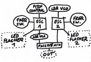 - OSC2 pitch control via a LDR (making it a crude VCO, not reliable in terms of Hz/V but dependent on light exposure)