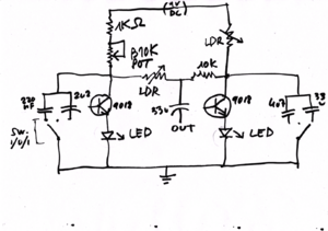 - OSC2 pitch control via a LDR (making it a crude VCO, not reliable in terms of Hz/V but dependent on light exposure)