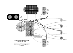 - OSC1 output volume control via LDR (the effect is a kind of VCA, you can get interesting side-chaining/sagging effects combining OSC1 LDR with OSC2 LED)